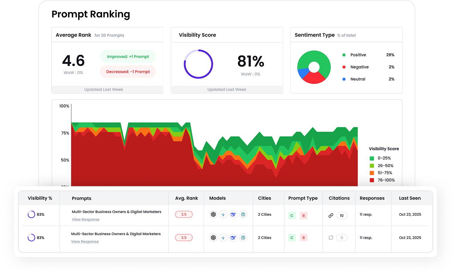 Rankings update continuously based on real-time AI search responses and prompt visibility.